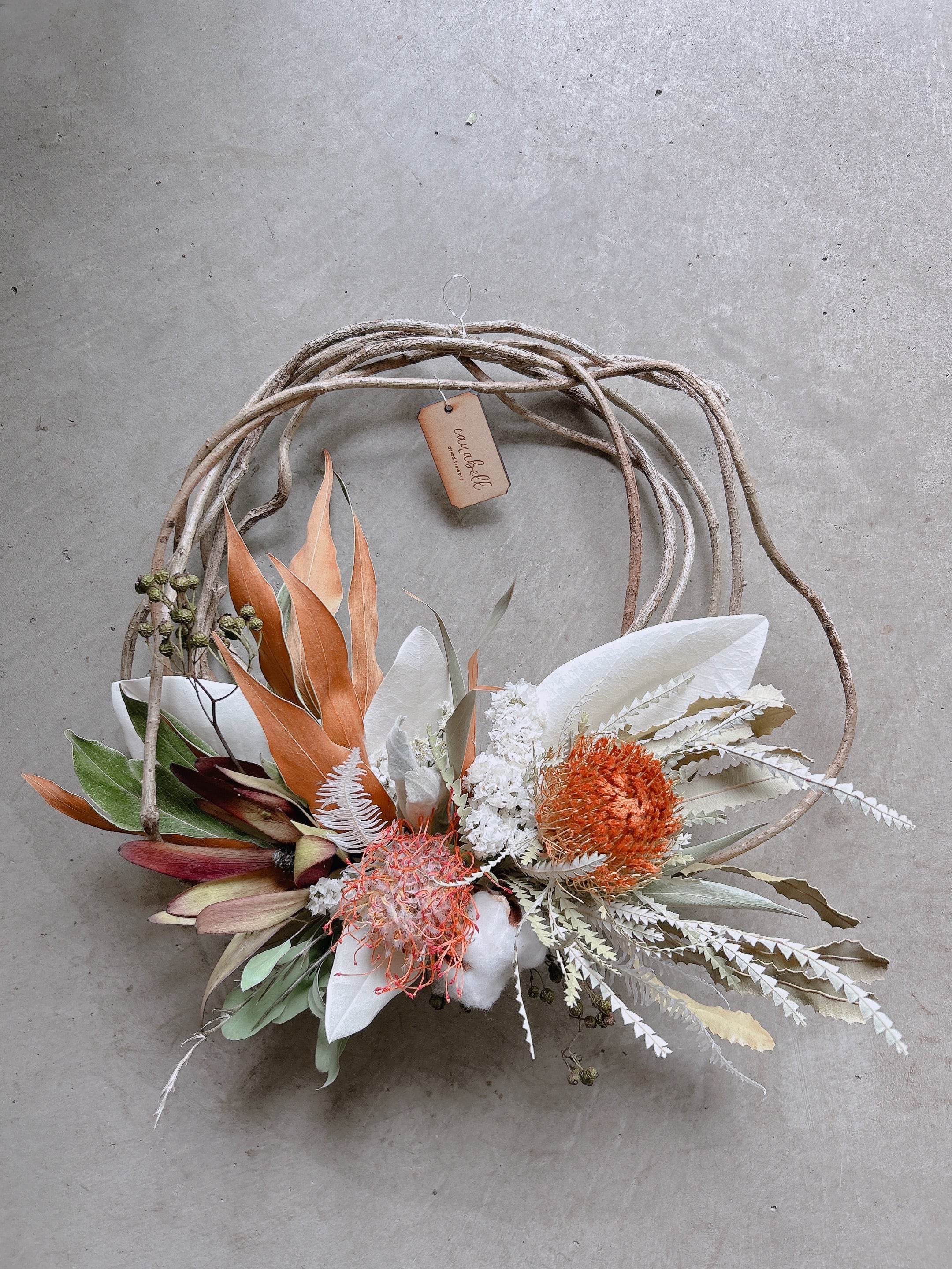 使用花材は、マグノリア、ピンクッション、グレビレアゴールド、フォルモーサ、リューカ、ユーカリ、野薔薇の実、スターチス。