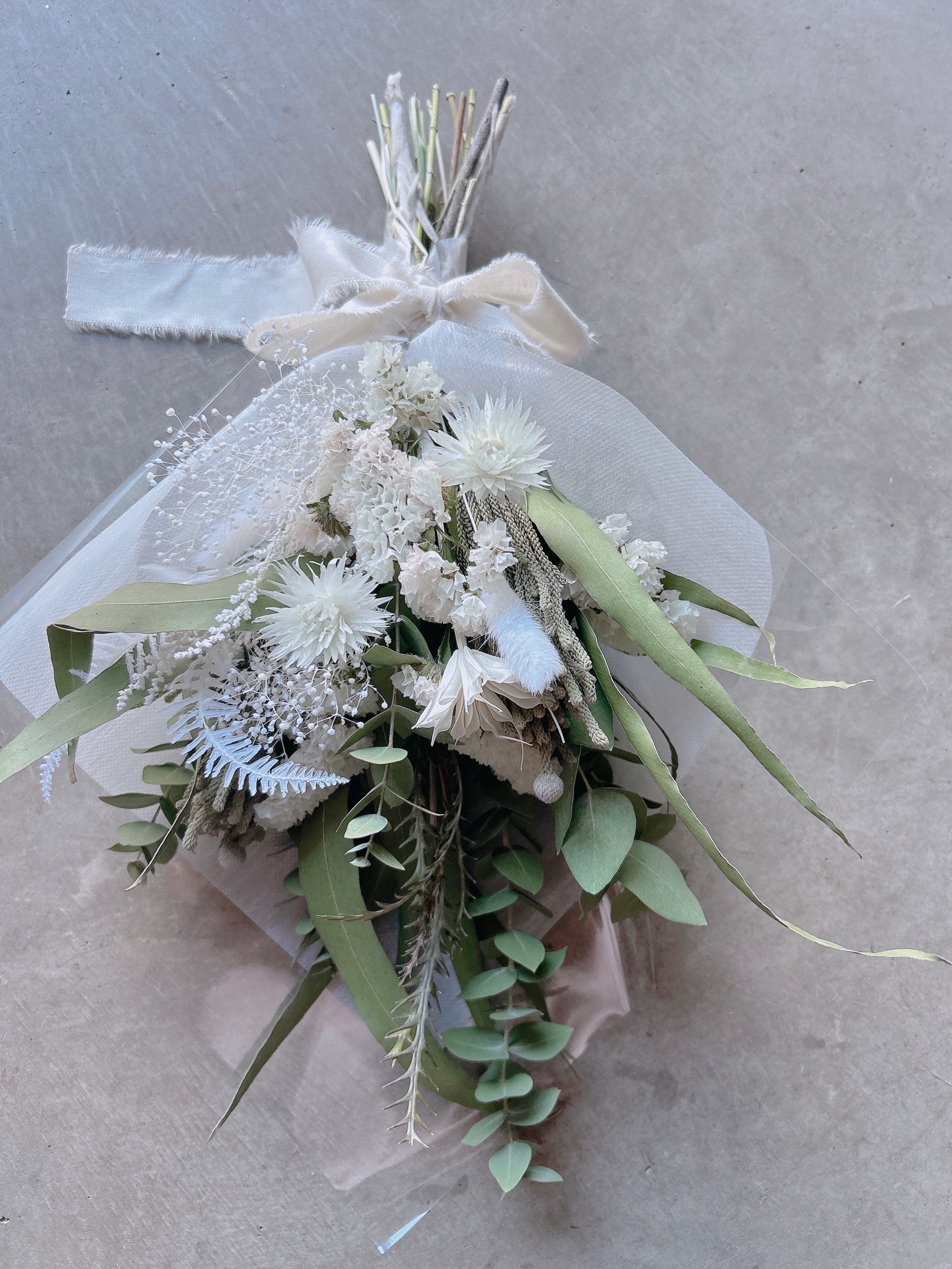 ホワイトの花材を合わせた、清涼感あふれるスワッグです。